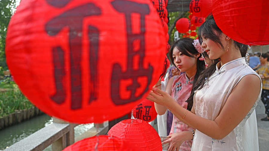 This photo taken on September 26, 2025 shows festivities at Nanquan ancient street in Binhu District, Wuxi City ahead of the upcoming Mid-Autumn Festival.