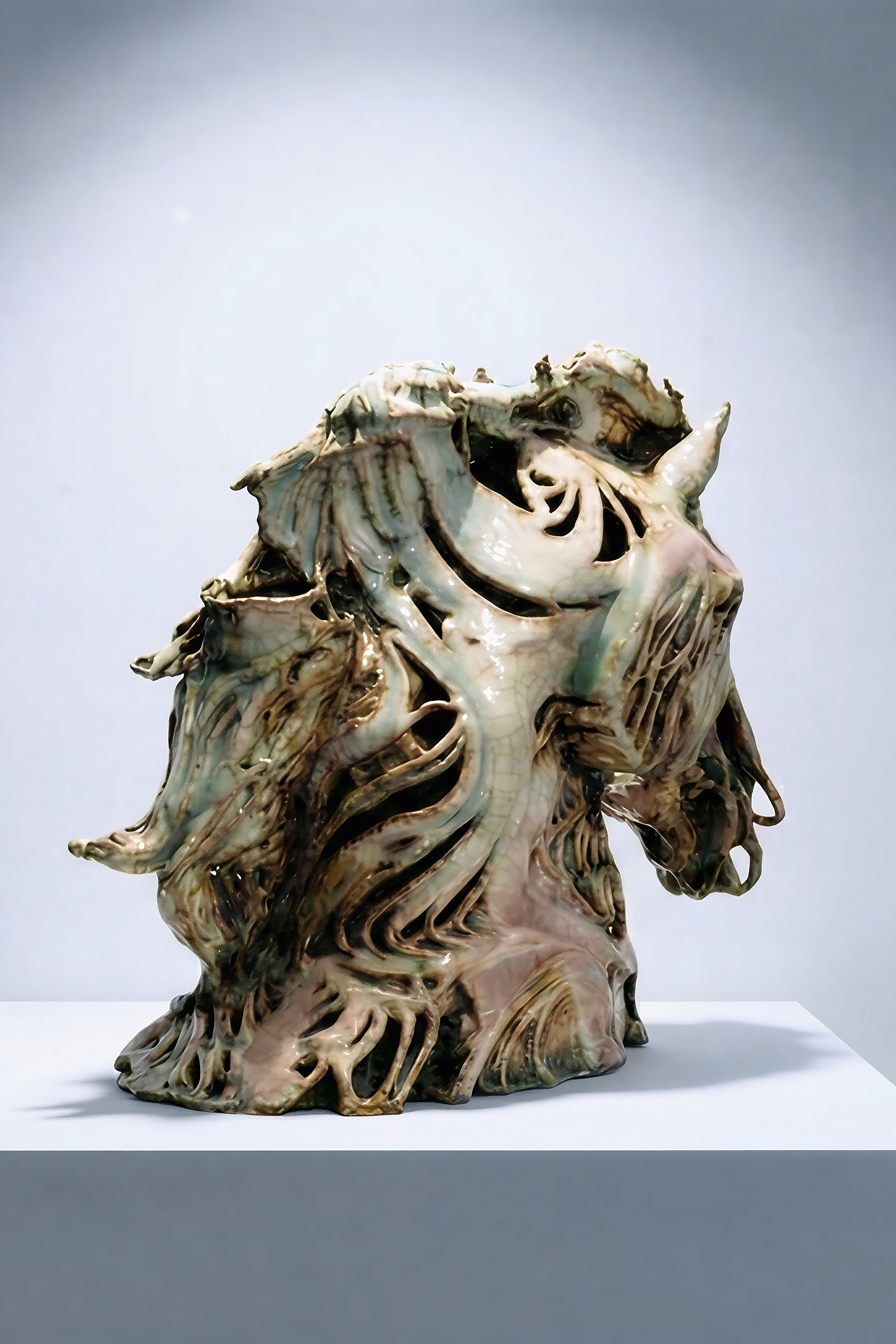 Using the "horse"—a universal spiritual totem transcending Eastern and Western civilizations—as its prototype, this work employs a parametric perspective of digital aesthetics to explore the "deterritorialized" expression and renewal of traditional zodiac symbols in the cyber era. The creation does not stop at a realistic replication of biological anatomy. Instead, it utilizes algorithmic logic to break the horse's inherent contours, dissolving its physical form into a fluid state of "becoming." This exaggerated fluid language represents a young creator's contemporary reconstruction of an ancient totem through digital technology, achieving a leap from traditional "static representation" to digital "process aesthetics."