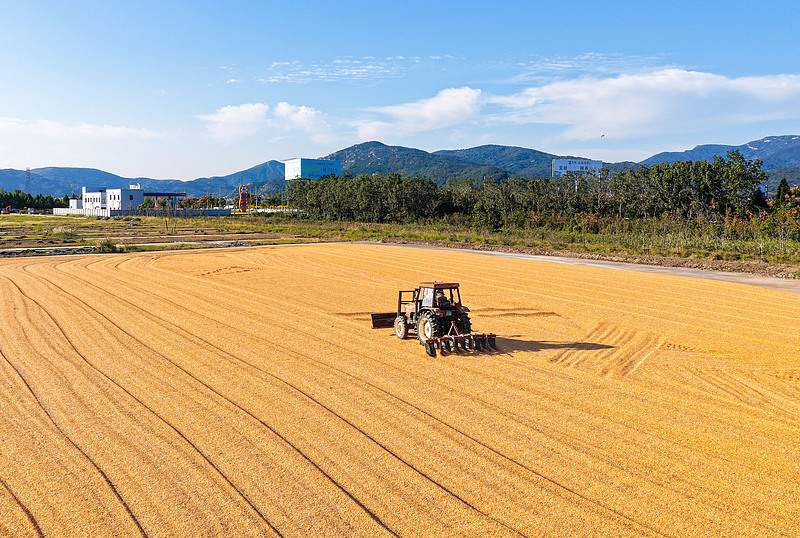This photo, taken on October 22, 2025, shows corn being air-dried at Yuntai Farm in Haizhou District, Lianyungang City. The golden harvest set against the clear blue sky creates a vibrant autumn scene. (Photo/CFP)