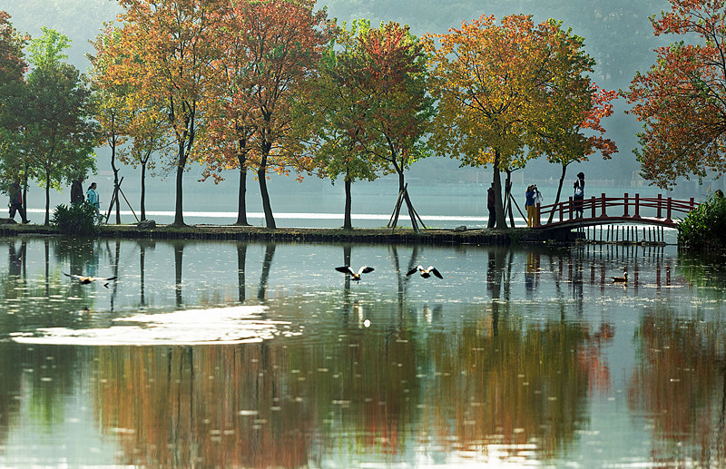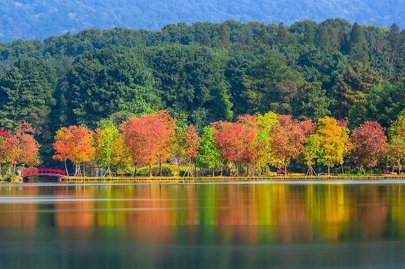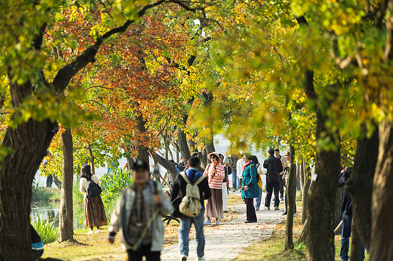 Visitors enjoy the colorful autumn foliage along the Crescent Bank at Zhongshan Botanical Garden in Nanjing, November 2, 2025. (Photo/CFP)