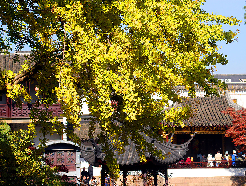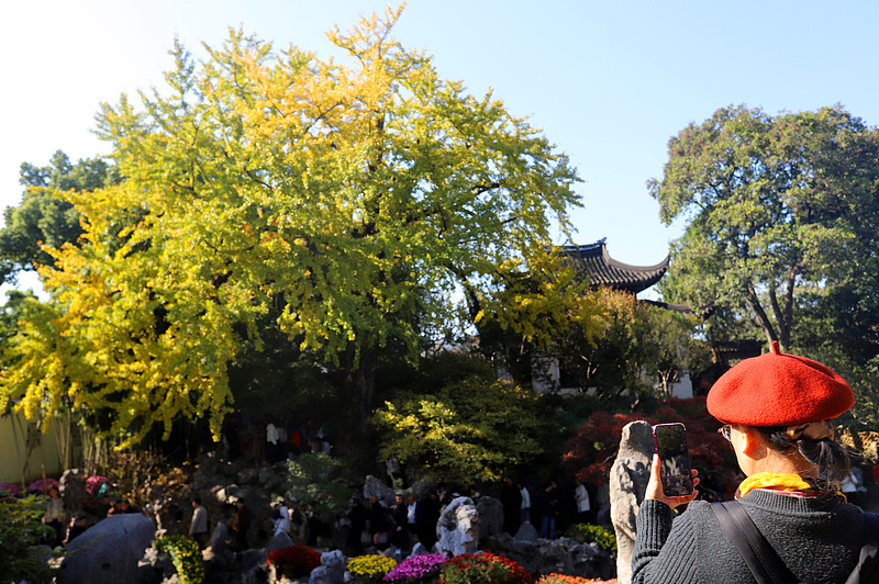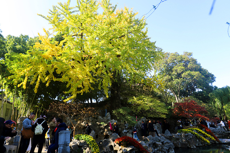 Photo taken on November 26 shows leaves of a ginkgo tree, which has a history of more than 400 years old in Suzhou's Lion Grove Garden, have turned golden. (Photo/CFP)