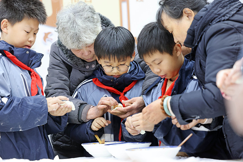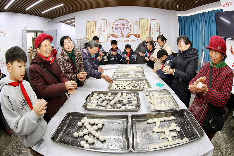 To celebrate the upcoming Winter Solstice, residents of Taoyuan Community and students from Donggang Primary School make dumplings and tangyuan, a type of glutinous rice dumpling, in Lianyun District, Lianyungang City, Jiangsu Province, December 17, 2025. (Photo/CFP)