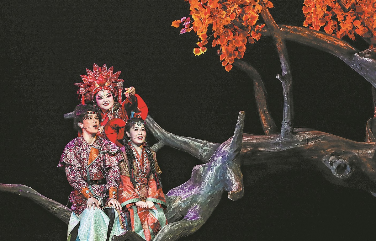 Performers stage a musical set in ancient Dunhuang at the Gansu Grand Theater in Lanzhou, Gansu province, on Oct 10. The show was jointly produced by leading artistes from China, the Republic of Korea and the United States. LANG BINGBING/XINHUA