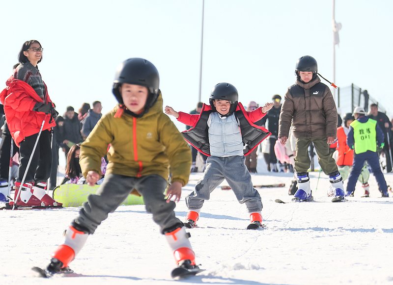 Photo taken on January 3 shows kids skiing at the Baohua Mountain Ski Resort in Jurong City, Jiangsu Province. (Photo/CFP)