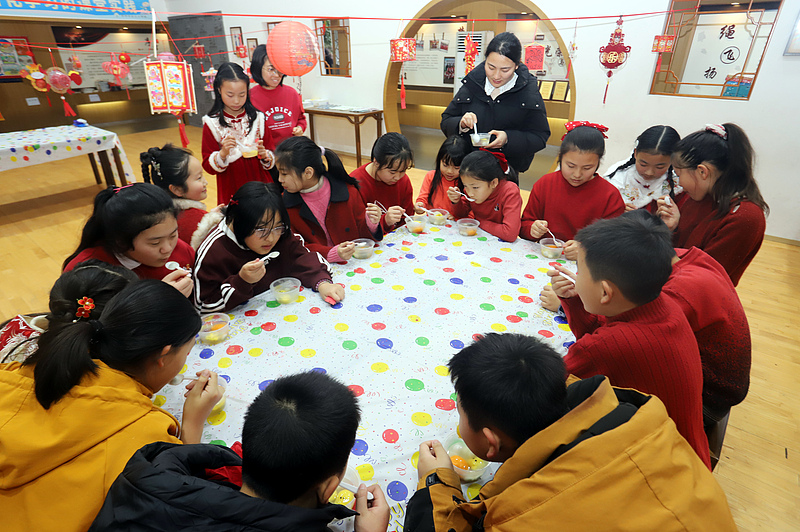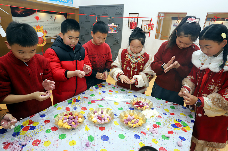 Photo taken on March 2 shows children and their teachers making tangyuan, the glutinous rice balls, to welcome the Lantern Festival at Xinzhuang Primary School in Suzhou, Jiangsu Province. The Lantern Festival falls on March 3 this year. (Photo/CFP)
