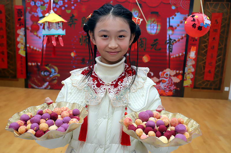 Photo taken on March 2 shows a girl showcasing tangyuan, the glutinous rice balls, to welcome the Lantern Festival at Xinzhuang Primary School in Suzhou, Jiangsu Province. The Lantern Festival falls on March 3 this year. (Photo/CFP)