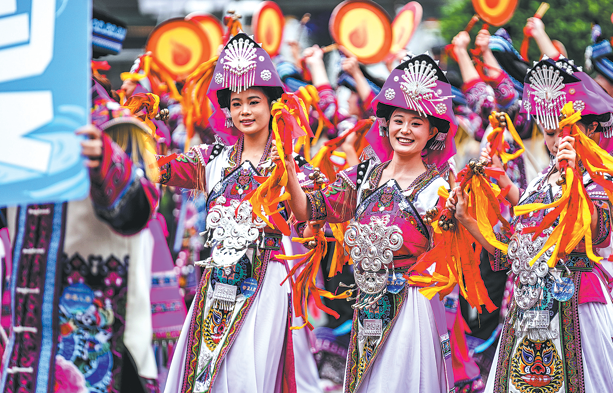 Performers from various ethnic groups participate in a parade in Guiyang, Guizhou province, on May 18. Nearly 3,600 participants showcased diverse ethnic cultures, vibrant intangible cultural heritage and immersive cultural tourism experiences at the event. Tao Liang/Xinhua