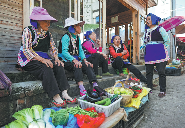 Ethnic Yi villagers chat at a wet market in Leju village in Xishan district of Kunming, Yunnan province, on July 27. CHEN XINBO/XINHUA