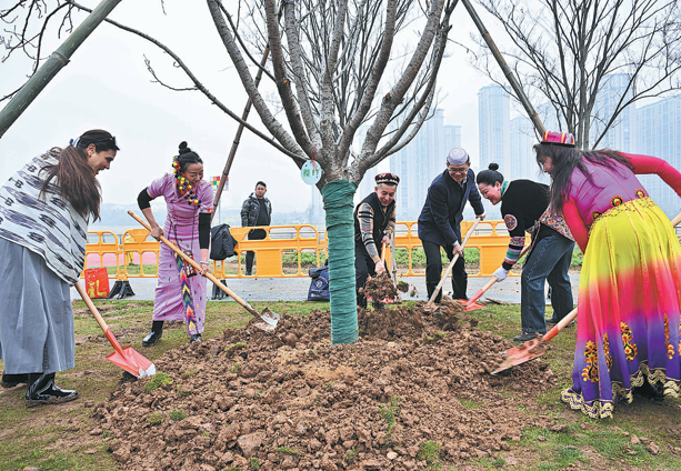 Representatives from 55 ethnic groups plant trees at a park in Yiwu, Zhejiang province, on March 11, 2025. LYU BIN/FOR CHINA DAILY