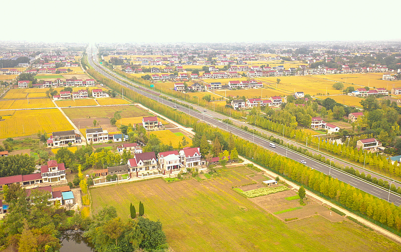 Rice crops ripen in the fields, creating a picturesque scene alongside rural roads and houses, in Xiayuan Town, Nantong City, Jiangsu Province, in this photo taken on October 26, 2025. (Photo/CFP)