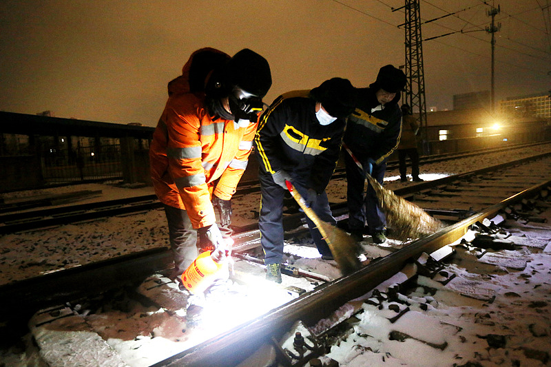 Photo taken on the early morning of January 20 shows workers clearing snow along the Lianyungang East Station. (Photo/CFP)