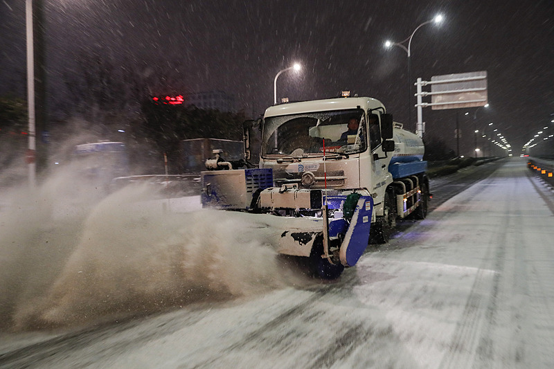 Photo taken on the early morning of January 20 shows workers clearing snow in Qingjiangpu District, Huai'an City. (Photo/CFP)