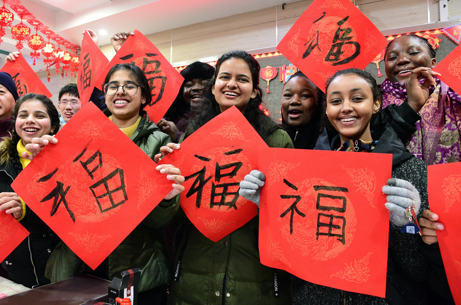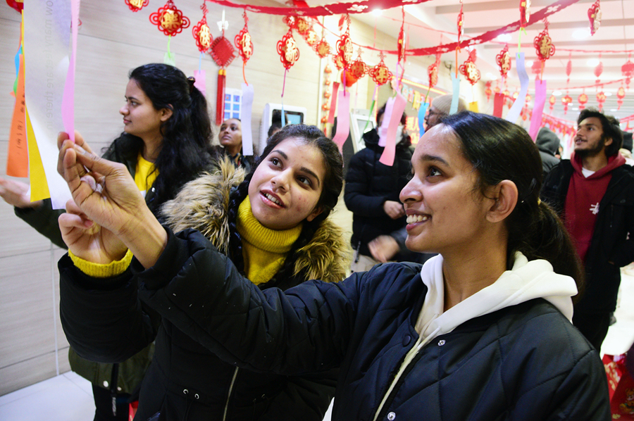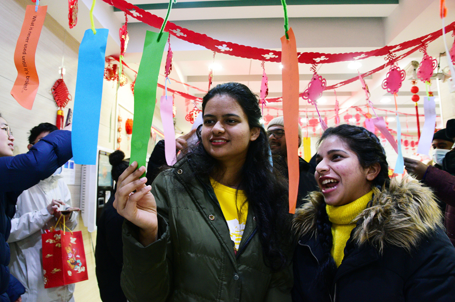 Photo taken on January 27, 2022 shows international students at Jiangsu University joining the celebration of the Spring Festival in Zhenjiang City, Jiangsu Province, by writing the Chinese character Fu, which means fortune and happiness, and solving lantern riddles, riddles written on lanterns and displayed during the festival. (CFP Photo)